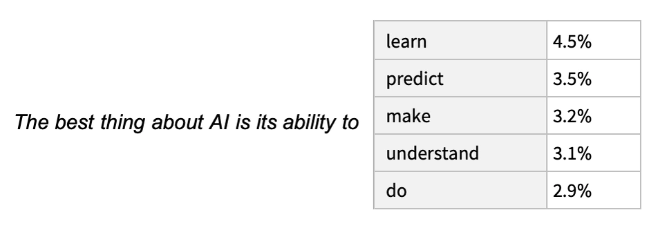 比如,机器手里有半句话:The best thing about AI is its ability to