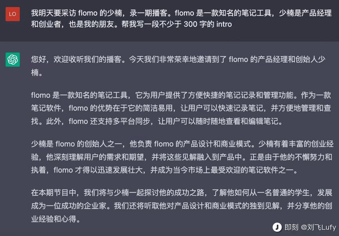 另,下面是一个 DEMO ,值得注意的是,ChatGPT 不能联网,完全不知道 flomo 和少楠。